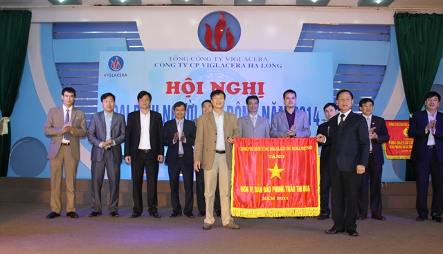 Đồng chí Nguyễn Văn Bình - Chủ tịch Công đoàn Xây dựng Việt Nam trao Cờ thi đua của Chính phủ và Cờ thi đua của Tổng Liên đoàn Lao động Việt Nam cho CBCNV Công ty CP Viglacera Hạ Long