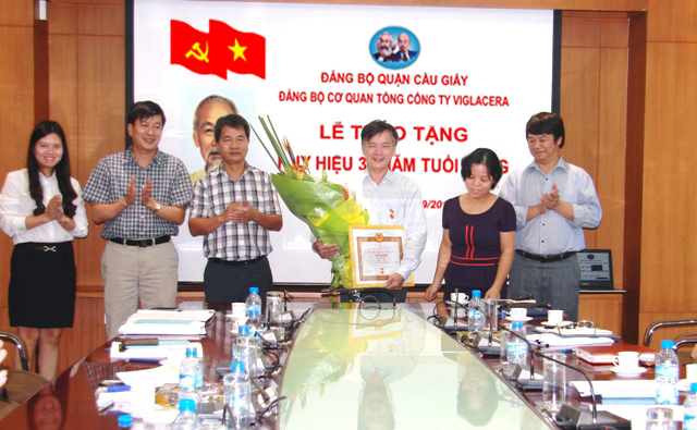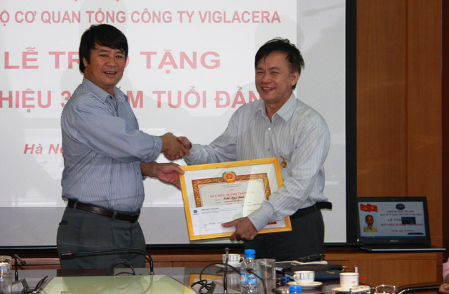 Nhân dịp này Đảng ủy cơ quan TCT đã long trọng tổ chức buổi lễ trao tặng Huy hiệu 30 năm tuổi Đảng cho PGS,TS Trần Ngọc Tính – Bí thư chi bộ Trường Cao đẳng nghề Viglacera. Thay mặt Đảng ủy đồng chí Nguyễn Anh Tuấn đã gắn Huy hiệu 30 năm tuổi Đảng cho đồng chí Trần Ngọc Tính.