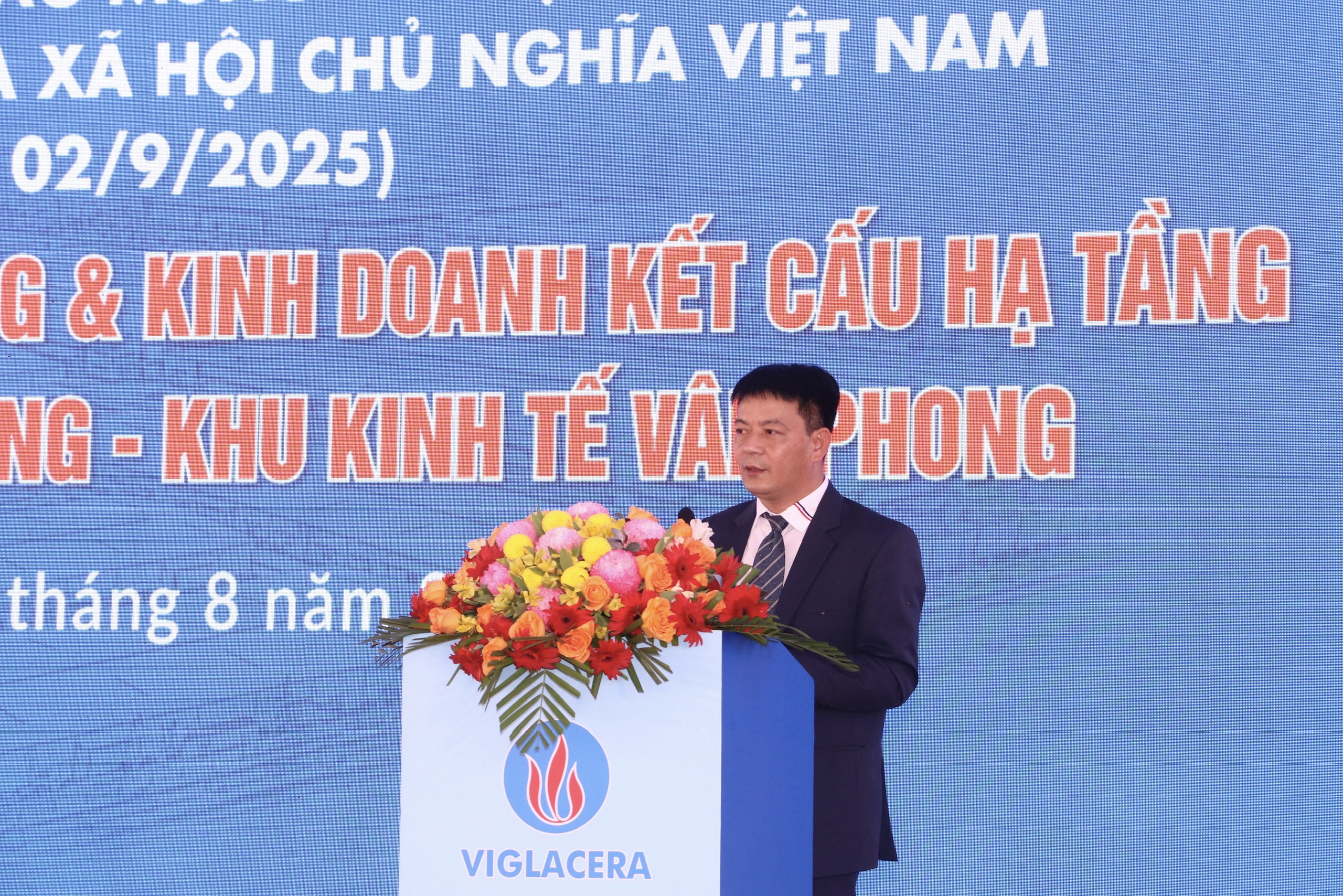 Đại diện cho chủ đầu tư dự án - Tổng công ty Viglacera, Phát biểu tại sự kiện, ông Trần Anh Tuấn - Giám đốc Ban Quản lý các dự án đầu tư phát triển Viglacera khẳng định quyết tâm đưa dự án hoàn thành đúng đường găng tiến độ và chất lượng: “Sau lễ khởi công này, Tổng công ty Viglacera cam kết sẽ tập trung mọi nguồn lực để dự kiến hoàn thành công tác giải phóng mặt bằng trong năm 2026, đầu tư xây dựng hạ tầng kỹ thuật hoàn thành trong năm 2028, đảm bảo chất lượng, tiến độ, đồng bộ, tiện nghi, hiện đại, bảo vệ tốt môi trường, sớm đưa KCN vào hoạt động, sẵn sàng mặt bằng sạch đón các nhà đầu tư lớn trong và ngoài nước, nhanh chóng phủ kín diện tích cây xanh trên mặt bằng theo quy hoạch của dự án; thực hiện theo đúng định hướng phát triển khu công nghiệp sinh thái, hiện đại, văn minh”.
